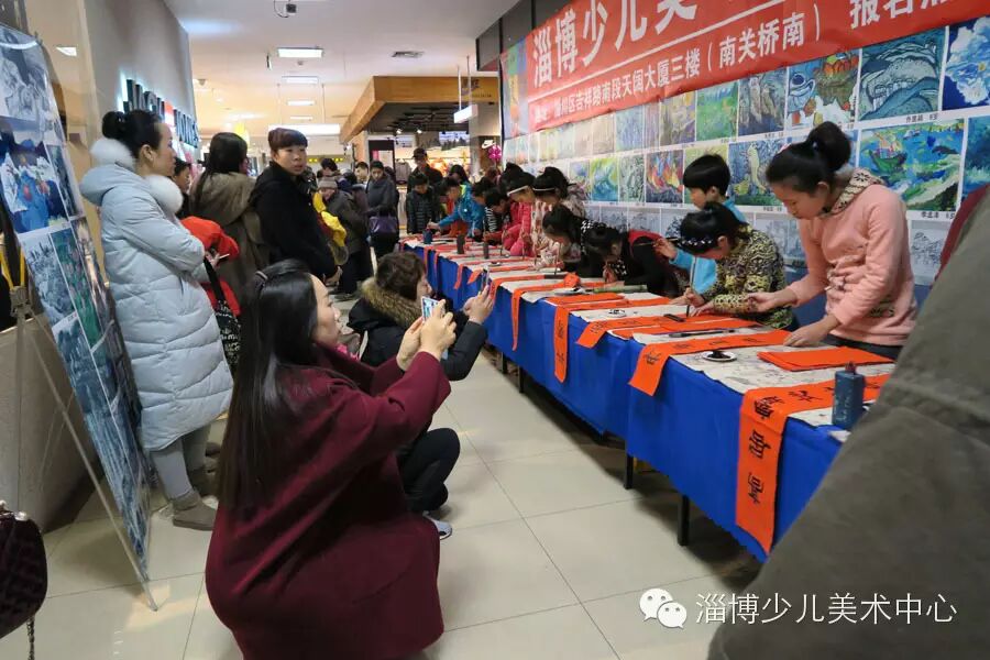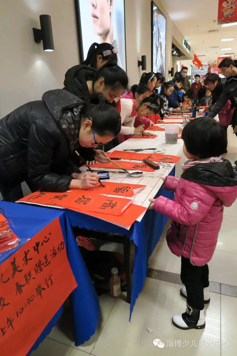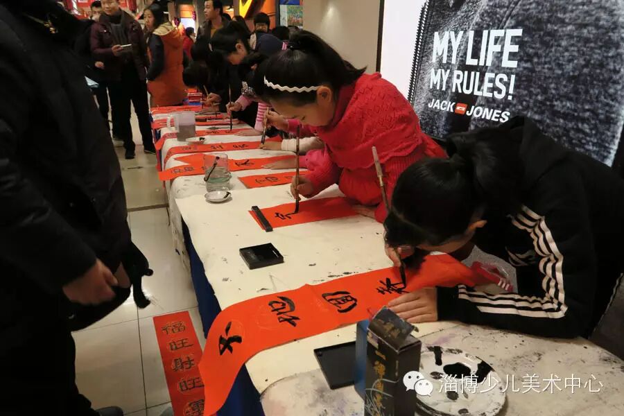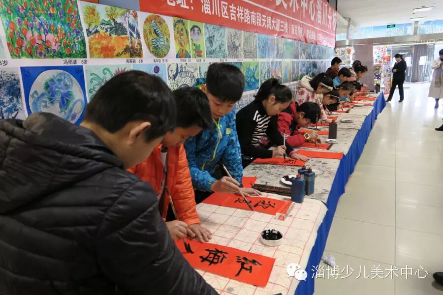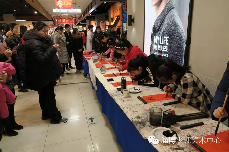 2016年1月31日上午,淄博少儿美术中心淄川分校春联书写赠送活动在淄川银座总店圆满结束,这次春联书写活动得到了淄川社会各界及广大学生家长朋友们的广泛关注,现场热闹非凡,来来往往的行人们不断驻足,在近距离欣赏孩子们书法的同时,又得到了墨宝。对于我校书法班的孩子们来说,既锻炼了他们的书写能力,同时又是一次很好的课外展示。