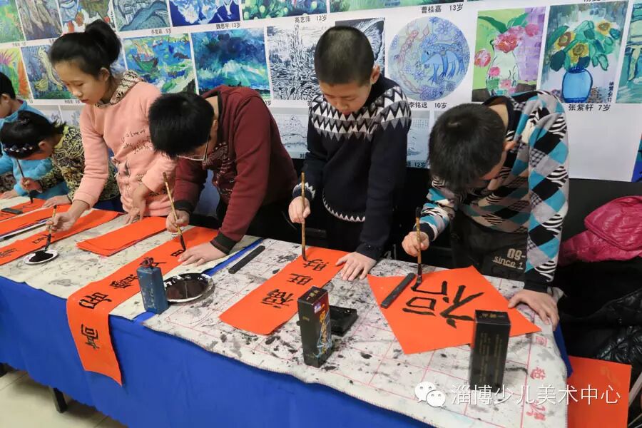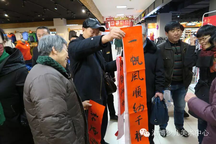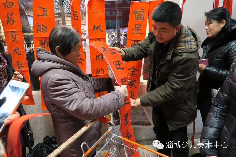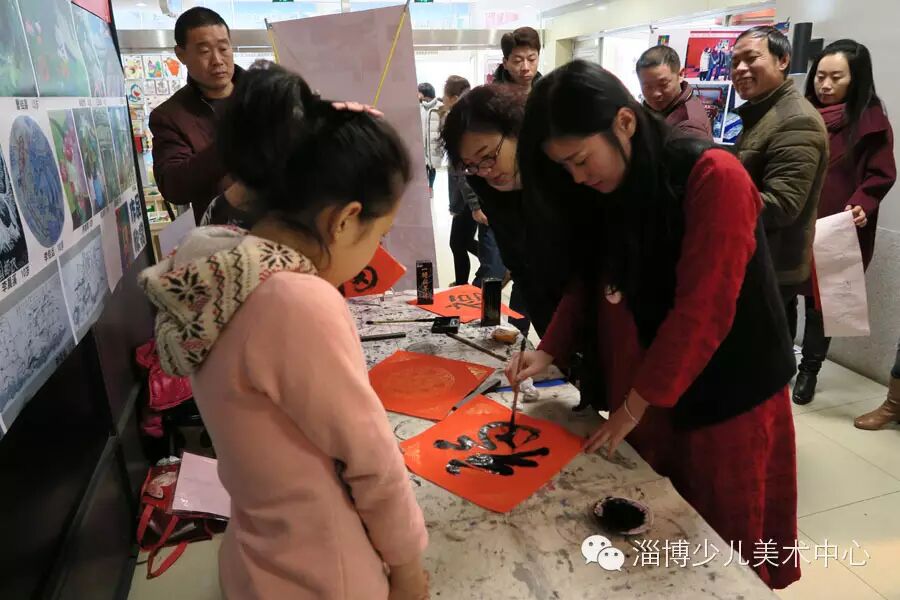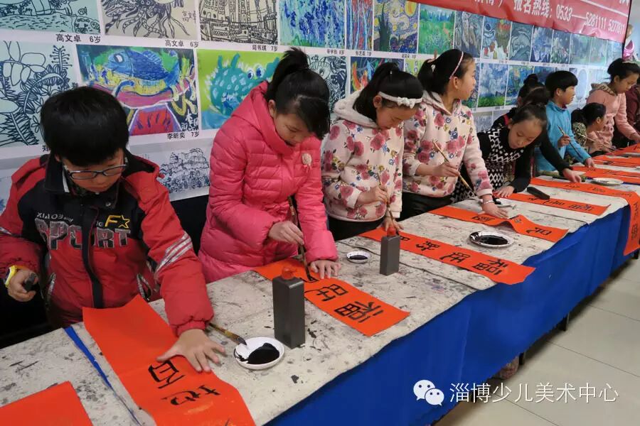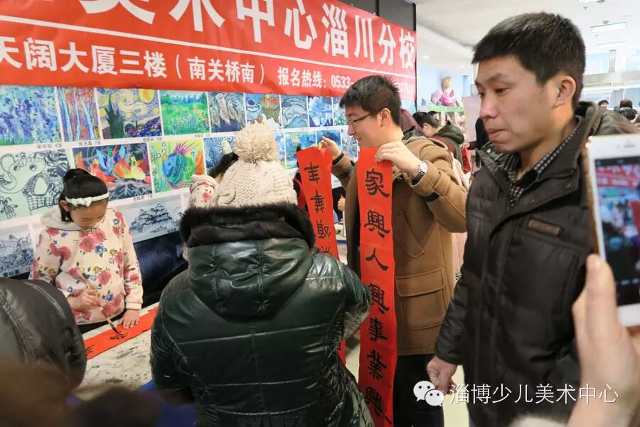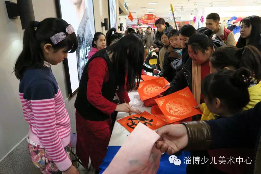 2016年1月31日上午,淄博少儿美术中心淄川分校春联书写赠送活动在淄川银座总店圆满结束,这次春联书写活动得到了淄川社会各界及广大学生家长朋友们的广泛关注,现场热闹非凡,来来往往的行人们不断驻足,在近距离欣赏孩子们书法的同时,又得到了墨宝。对于我校书法班的孩子们来说,既锻炼了他们的书写能力,同时又是一次很好的课外展示。